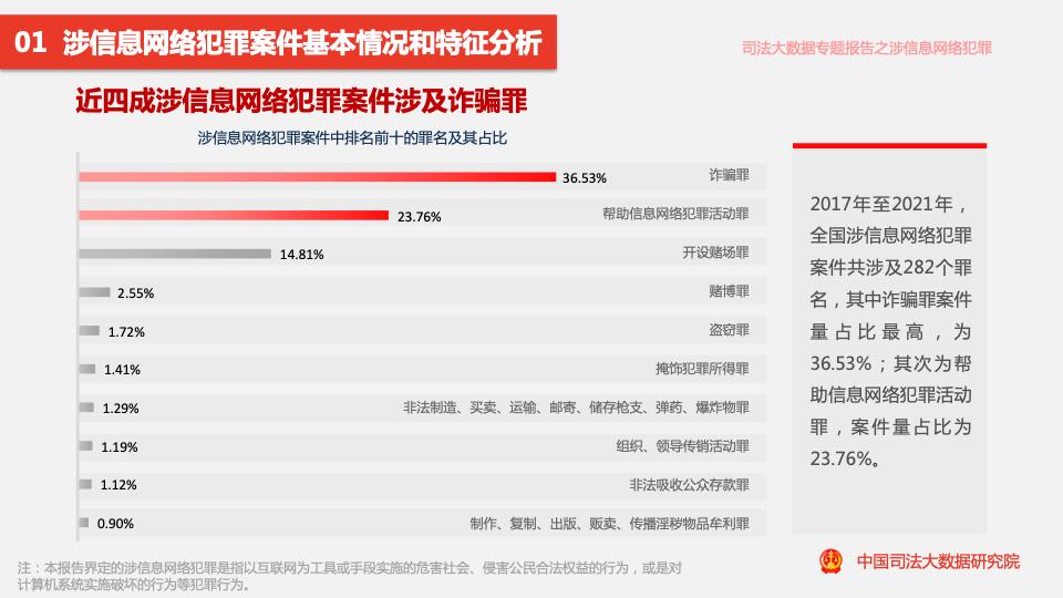 報告顯示,2017年至2021年,全國各級法院一審審結的涉信息網(wǎng)絡(luò )犯罪案件共計28.20萬(wàn)余件,案件量呈逐年上升趨勢。案件共涉及282個(gè)罪名,其中詐騙罪案件量占比最高,為36.53%;其次為幫助信息網(wǎng)絡(luò )犯罪活動(dòng)罪,案件量占比為23.76%。