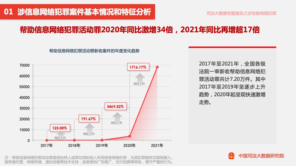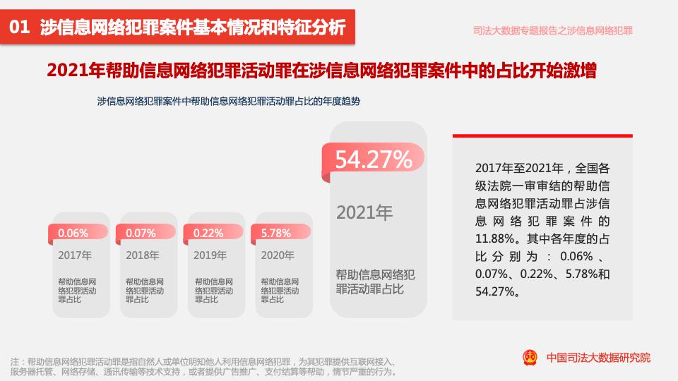 報告顯示,2017年至2021年,全國各級法院一審審結的幫助信息網(wǎng)絡(luò )犯罪活動(dòng)罪案件量占涉信息網(wǎng)絡(luò )犯罪案件量的11.88%。