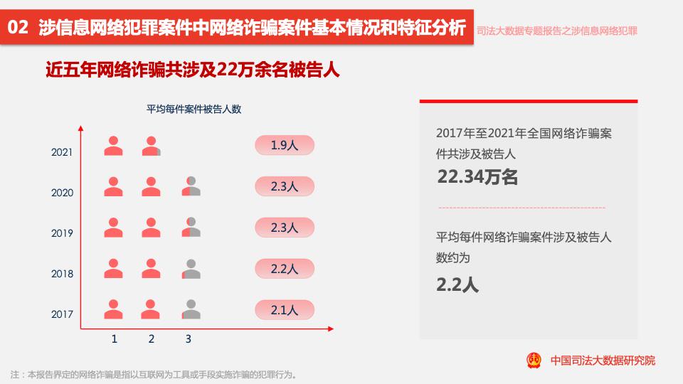 五年來(lái),全國涉信息網(wǎng)絡(luò )犯罪案件共涉及66萬(wàn)余名被告人,平均每件案件涉及被告人數約為2.4人。其中,3人及以上的共同犯罪案件占比為9.50%。