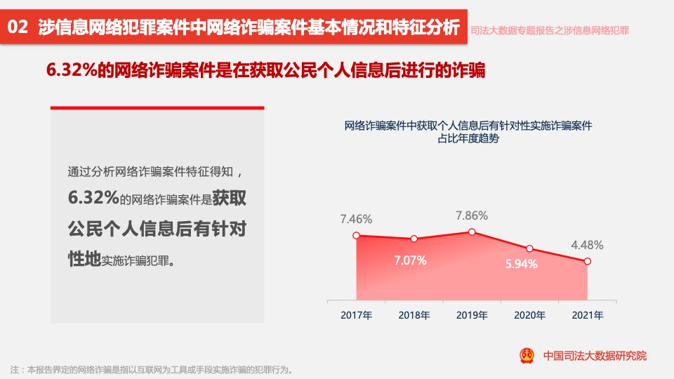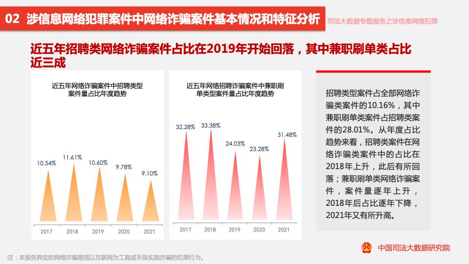 報告顯示,2017至2021年,涉信息網(wǎng)絡(luò )犯罪案件數量呈逐年上升趨勢,近四成案件涉及詐騙罪,2021年網(wǎng)絡(luò )詐騙類(lèi)案件量同比下降17.55%,是近5年來(lái)首次下降。